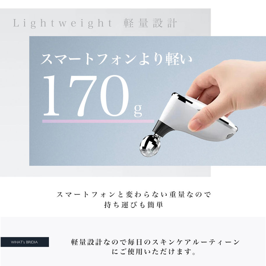 ブリディアは、1分間に数百回の高周波振動とEMS機能が付いている美顔器です。Y字型ローラーのデザインは少しの力で肌を吸い上げ、マッサージします。IPX5の防水機能が搭載されているため、お風呂場でも使用することができ、わずか170gと軽量なので、毎日のケアに最適です。美しい肌を手に入れたい方におすすめのアイテムです。
